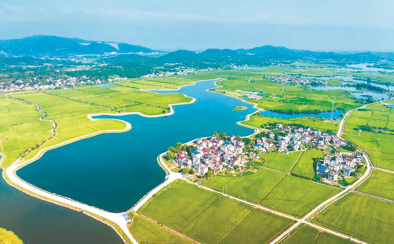 9月6日,蕪湖市繁昌區(qū)平鋪鎮(zhèn)郭仁村,新平灌區(qū)內(nèi)碧綠的稻田與村莊、道路、水系等交相輝映,勾勒出一幅美麗的鄉(xiāng)村田園畫卷。通訊員 肖本祥 攝/視覺安徽